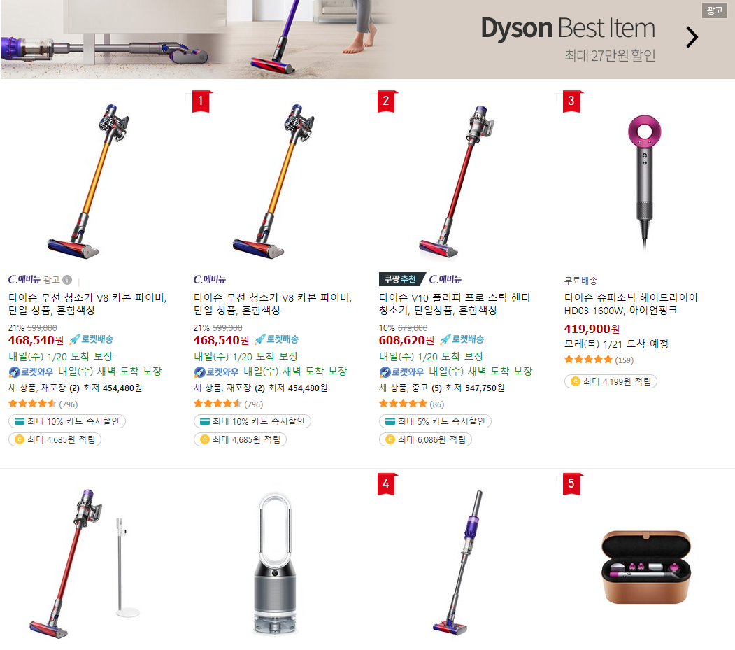 요즘 쿠팡에서 다이슨 제품을 많이 할인해주고 있는데그 중 Best Item 을 최대 27만원까지 할인한다고 하네요.
