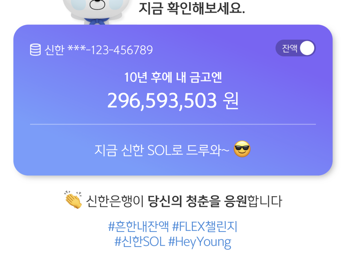 버튼이 있는데, 전 이미 오픈 뱅킹을 이용했고, 신한은행 첫거래도 아니라서 #10년후 Hey young 머니박스만 뽑을 수 있었어요!